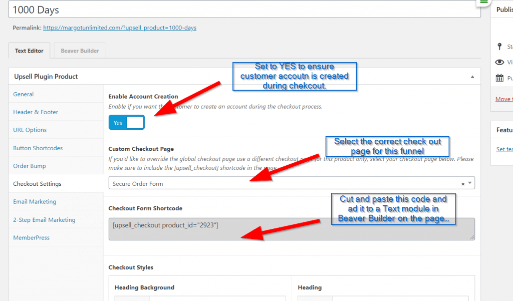 Each funnel has a unique checkout page - these settings connect the order form page for this membership with the funnel.