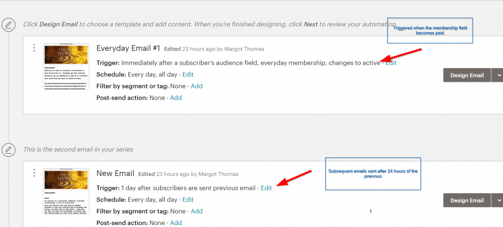 Subsequent emails are ONLY sent if the customer has not had the merge field changed to PAID indicating that they have bought the product (Active set by the Memberpress Subscription).